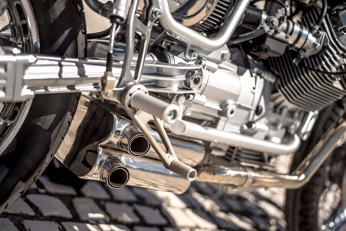 The stand out modification to the Nevada’s 750cc v-twin is the custom stainless steel silencers located discreetly beneath the swingarm. Along with improving performance Rua have conscientiously ensured that their sound is also discreet to stress-free homologation. A single chrome covered K & N filter fulfills the role that was previously managed by a plastic box and opens up the frame to balance out the bulk of the engine block. To dress the engine appropriately the rocker covers and the alternator cover wear classically styled aftermarket covers.